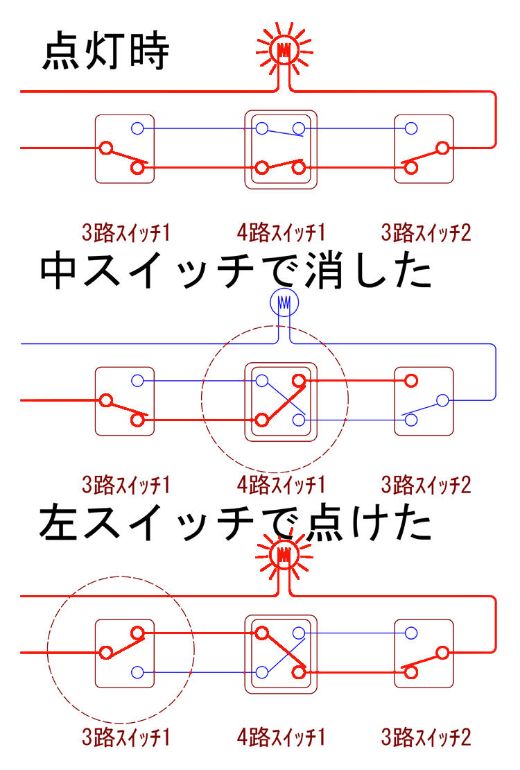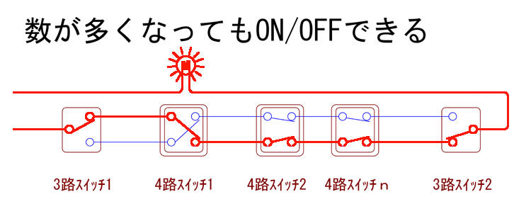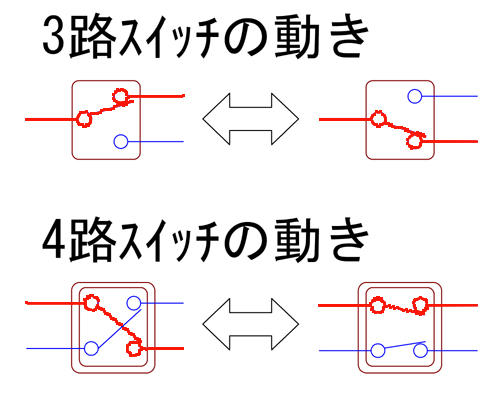 3つ以上のスイッチの場合は、3路と4路を組み合わせます。