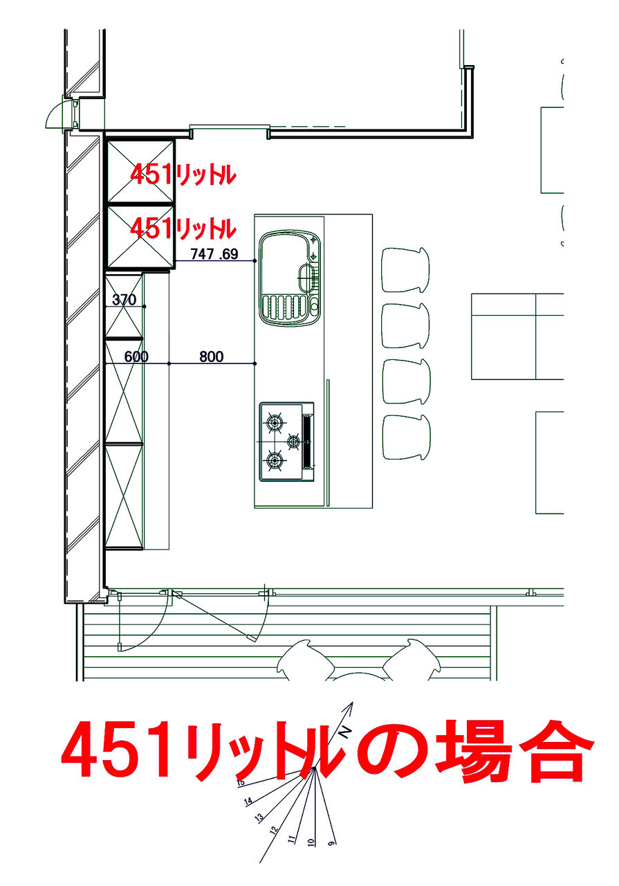 これを中くらいの奥行き633㎜の冷蔵庫とし、2台入れる。