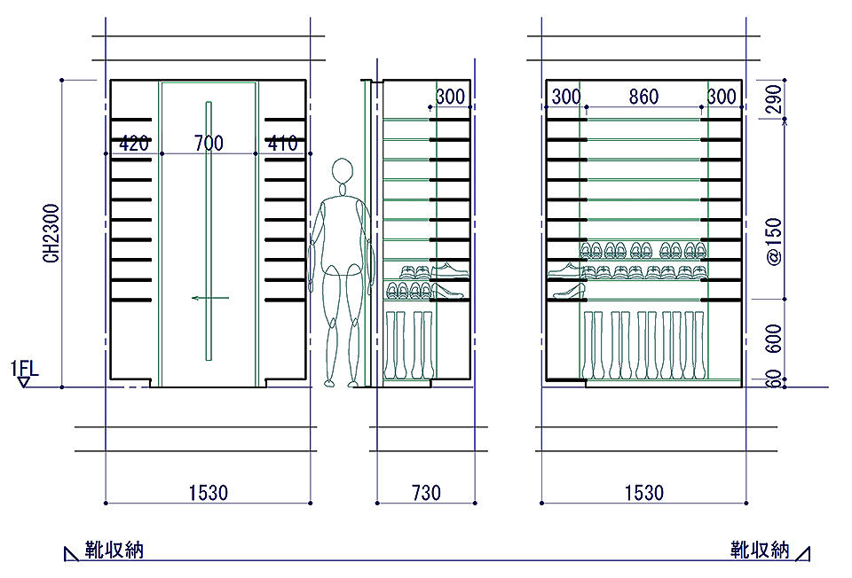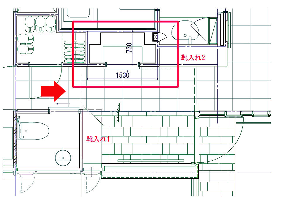 上の平面図では日常的に使う「靴入れ①」と「靴入れ②」がまずあります。