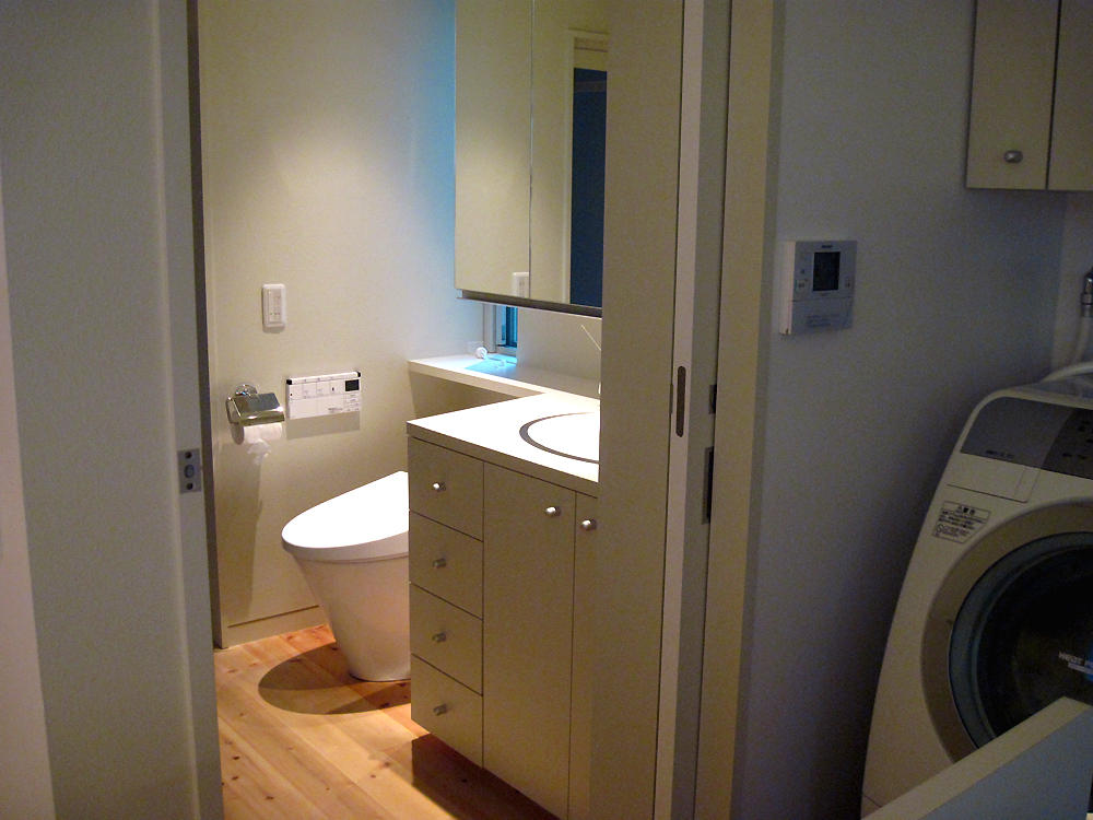下の写真、洗面所への戸は壁の中に引き込まれています。(洗面器と右の洗濯機との間。)