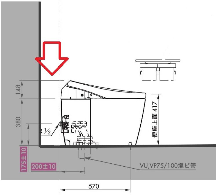 普通、腰掛け便器の背面はピッタリ壁についている。