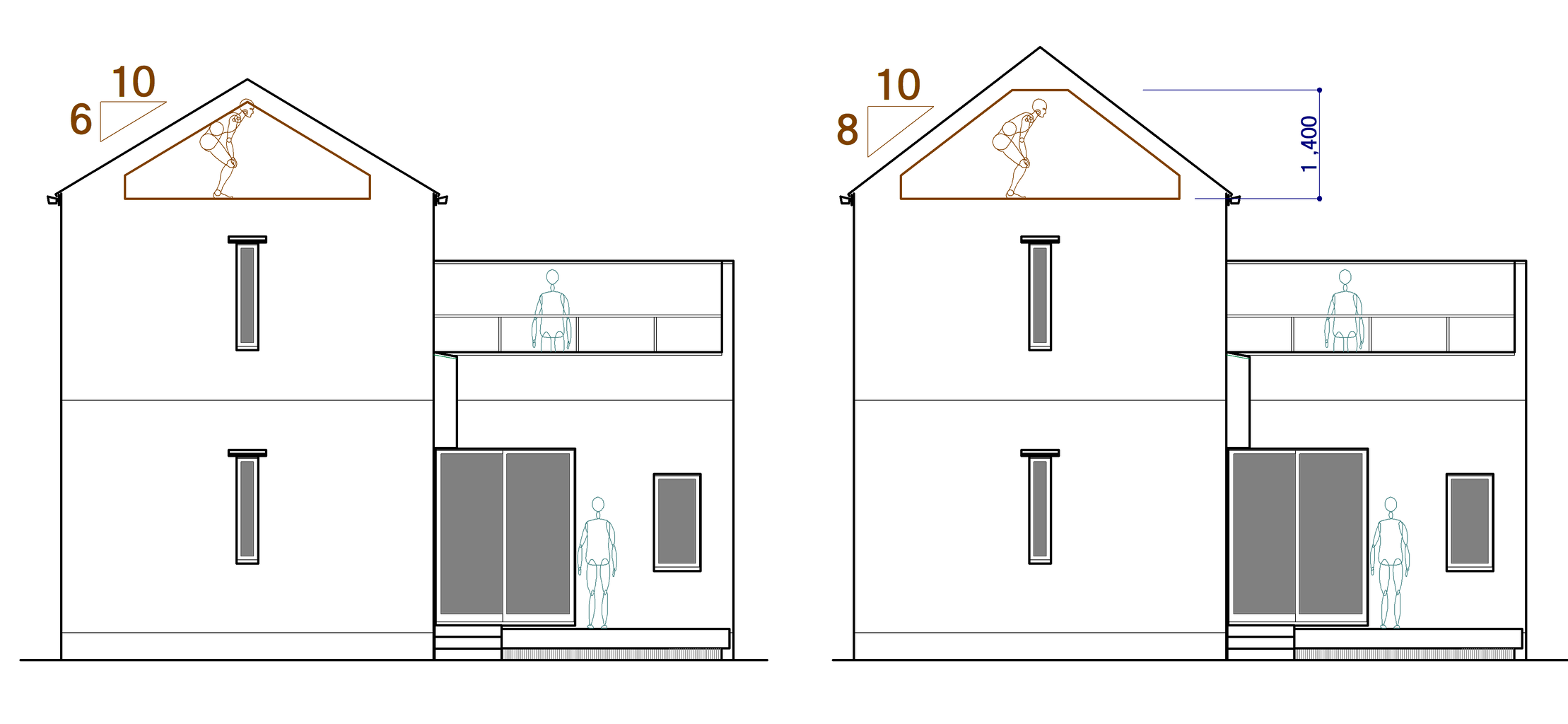 左は屋根勾配6/10、右は屋根勾配8/10。